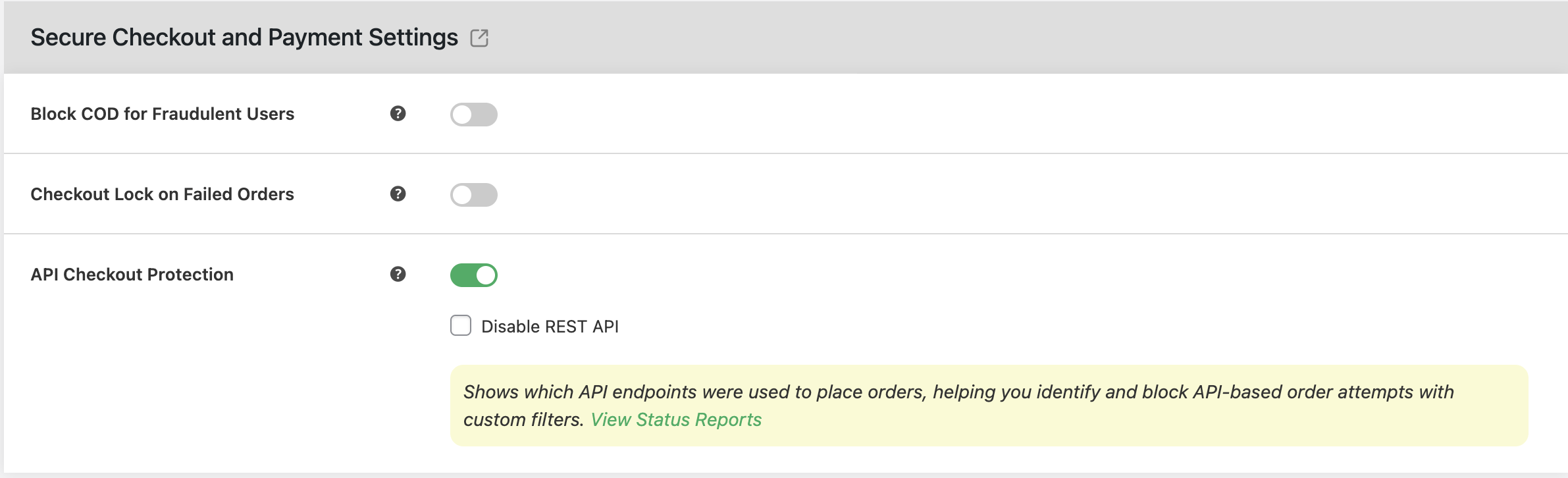 The API Checkout Protection feature helps secure your WooCommerce REST/Store API checkout flow by preventing fraudulent orders via REST API endpoints. When enabled, selected REST routes are blocked.