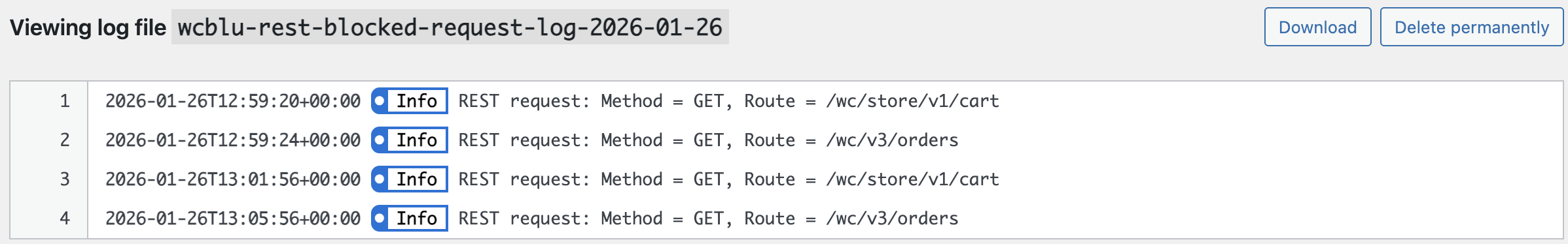 /wc/. - For each matching request, a log entry is created under WooCommerce logs with the tag wcblu-rest-blocked-request-log.