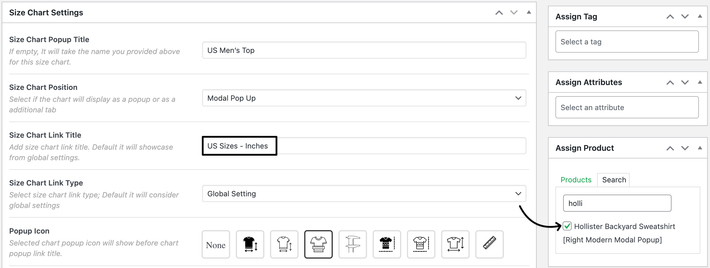 Multiple size charts per product — create more than one chart and assign them all to a single product. Each chart keeps its own title, layout, and display position (Popup / Tab / Inline).