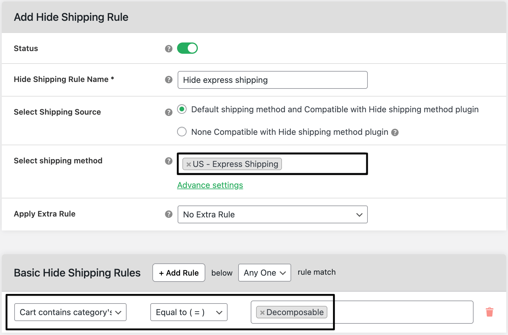- Rule: Hide Express Shipping when Shipping Class = Decomposable