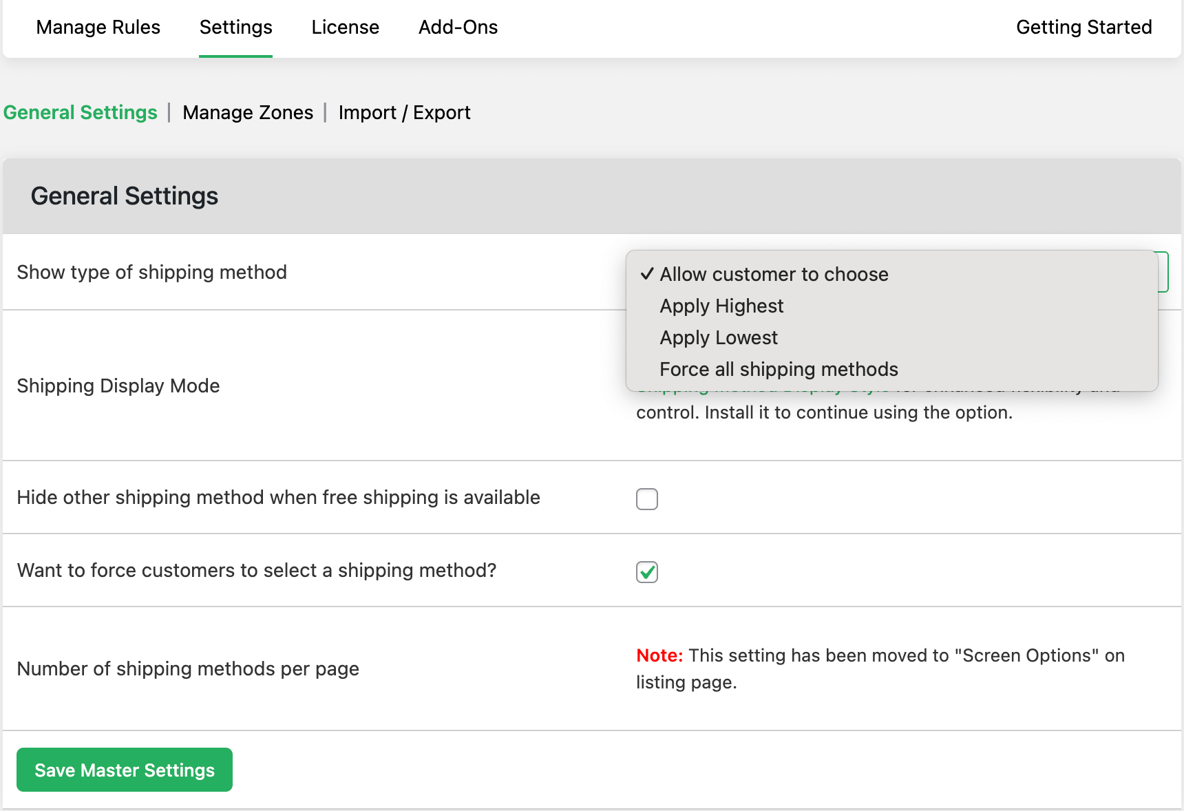 Master settings help you with that. You can find the master settings section on the main plugin page itself. It is present just below the list of shipping methods you’ve added to the date.