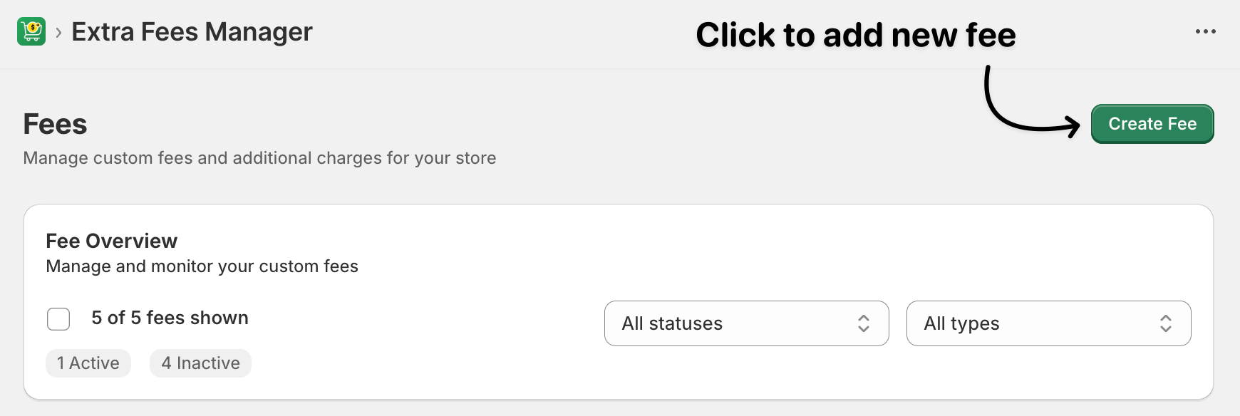 - In your Shopify admin, go to Apps → Extra Fee Manager.