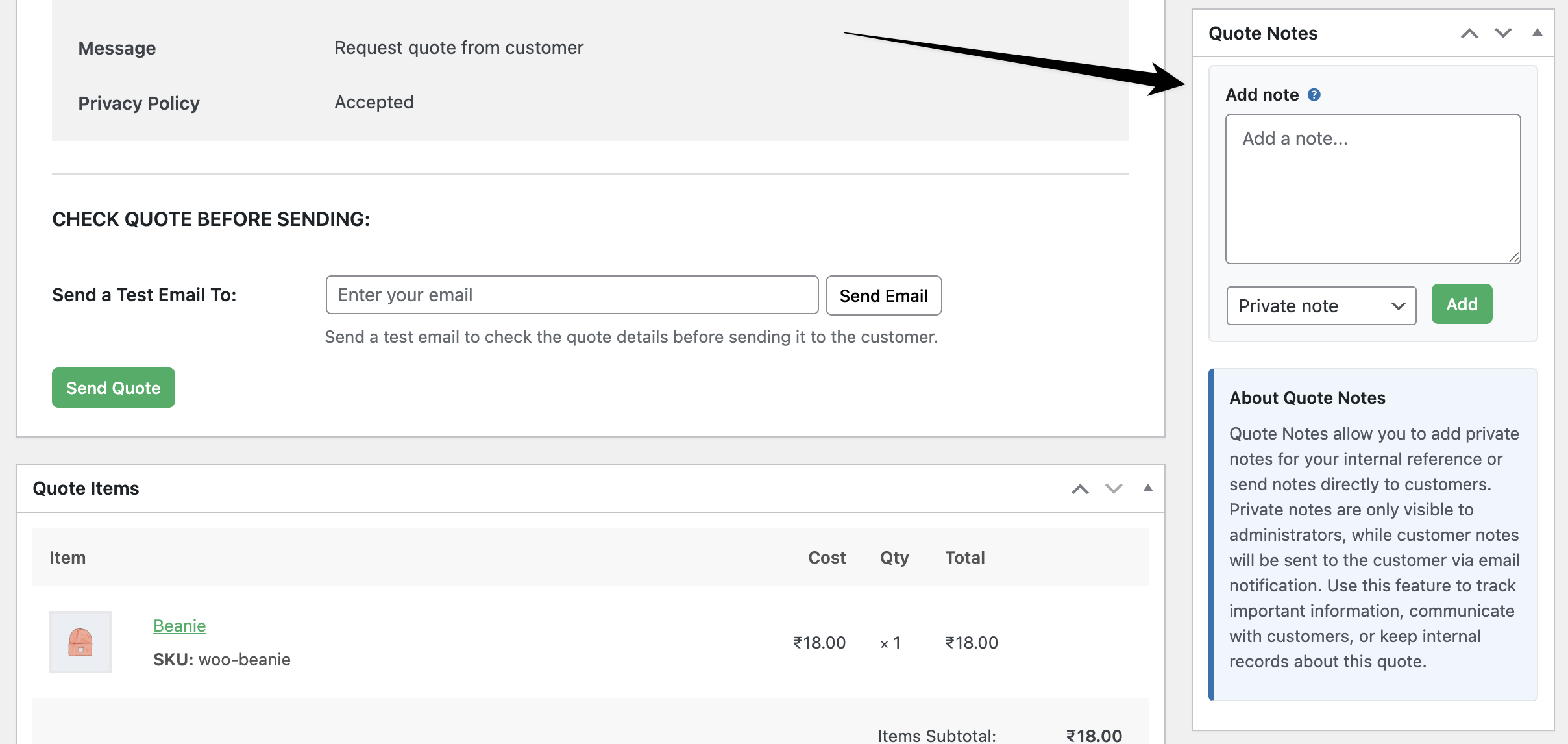 The Quote Notes meta box appears in the right sidebar of the quote request edit page. If you don't see it, check Screen Options (top right) and ensure "Quote Notes" is checked.