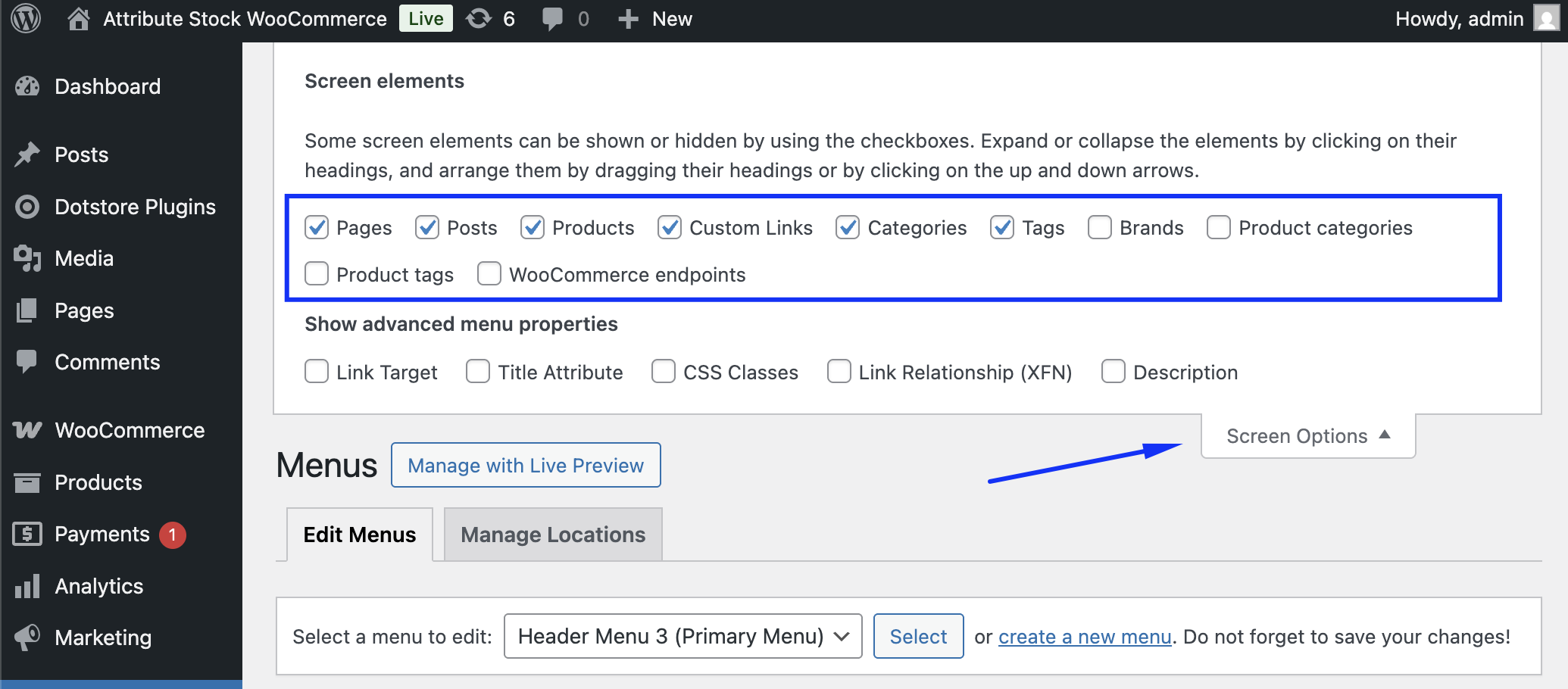 In Screen Options, tick the options you want to manage in the menu, such as: