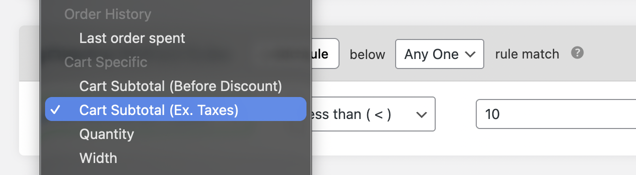 From the Condition dropdown, select Cart Subtotal (Ex. Taxes)